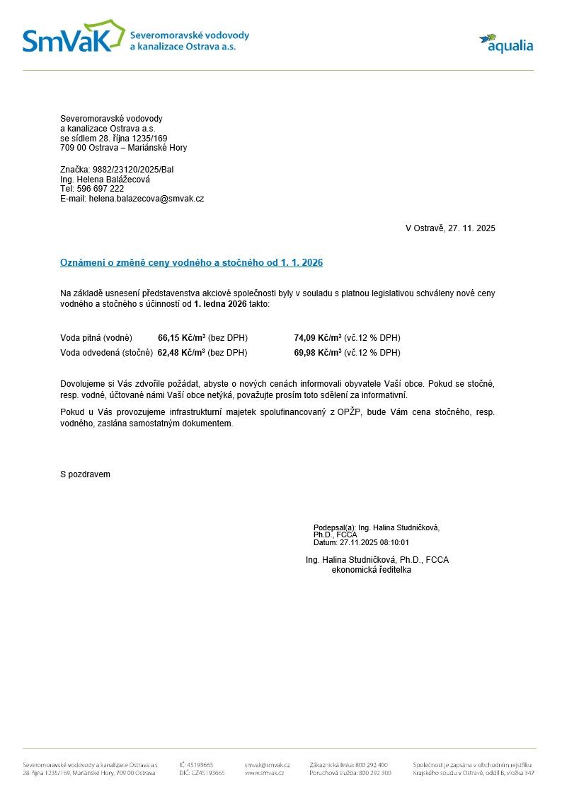 Oznámení o změně ceny vodného a stočného od 1. 1. 2026