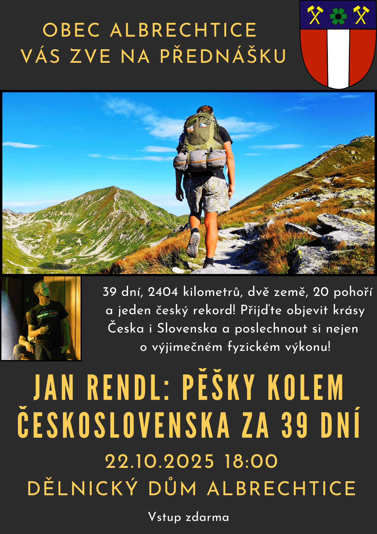 22.10.2025 od 18:00, Dělnický dům Albrechtice - Jan Rendl: Pěšky kolem Československa za 39 dní