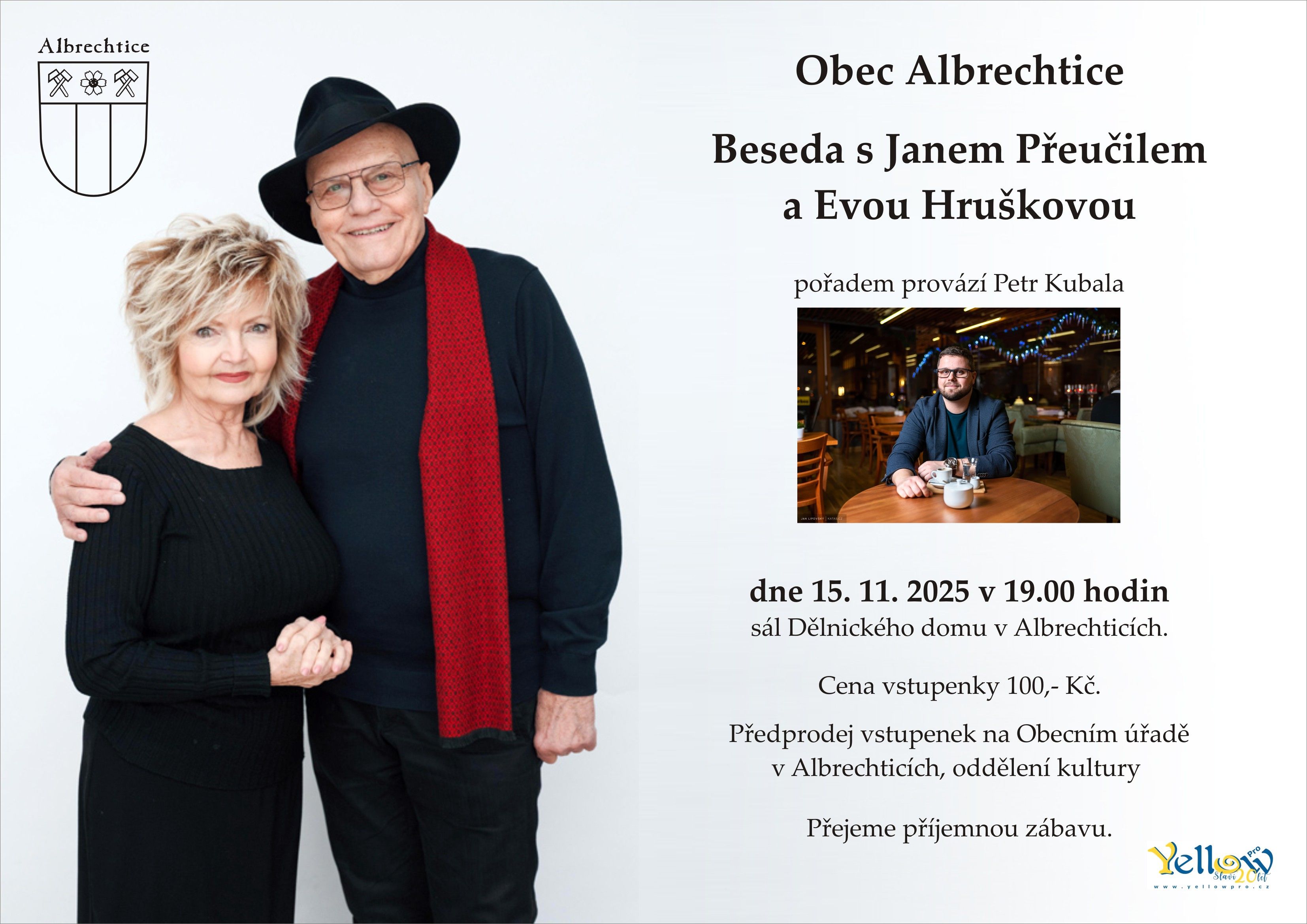 15.11.2025 od 19:00, Dělnický dům Albrechtice - Beseda s Janem Přeučilem a Evou Hruškovou, Předpodej vstupenek za 100,- na Obecním úřadě.