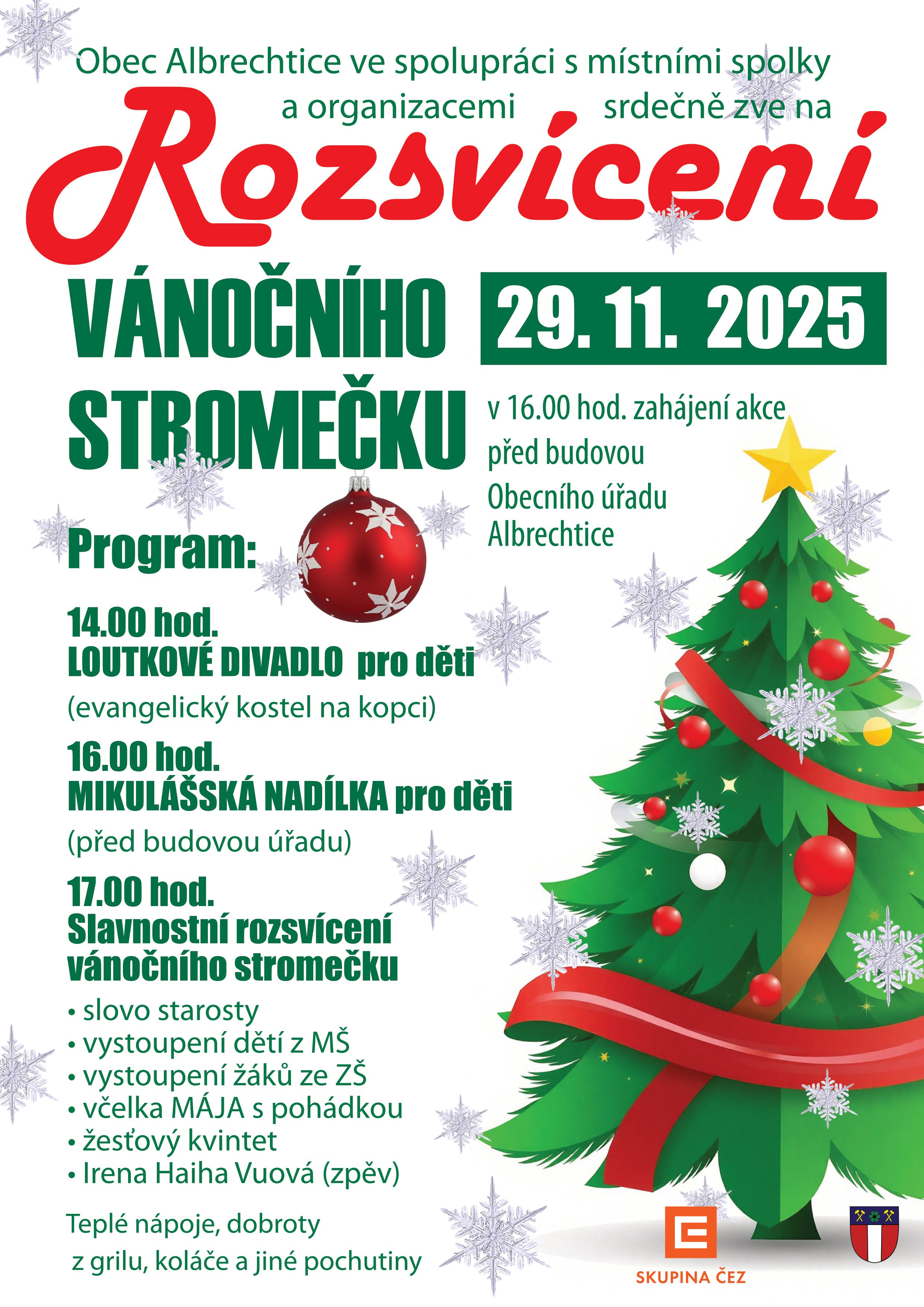 29.11.2025 od 14:00 před budovou Obecního úřadu Albrechtice - Rozsvícení vánočního stromu. (14:00-loutkové divadlo, 16:00 mikulášská nadílka, 17:00 Slavnostní rozsvícení)