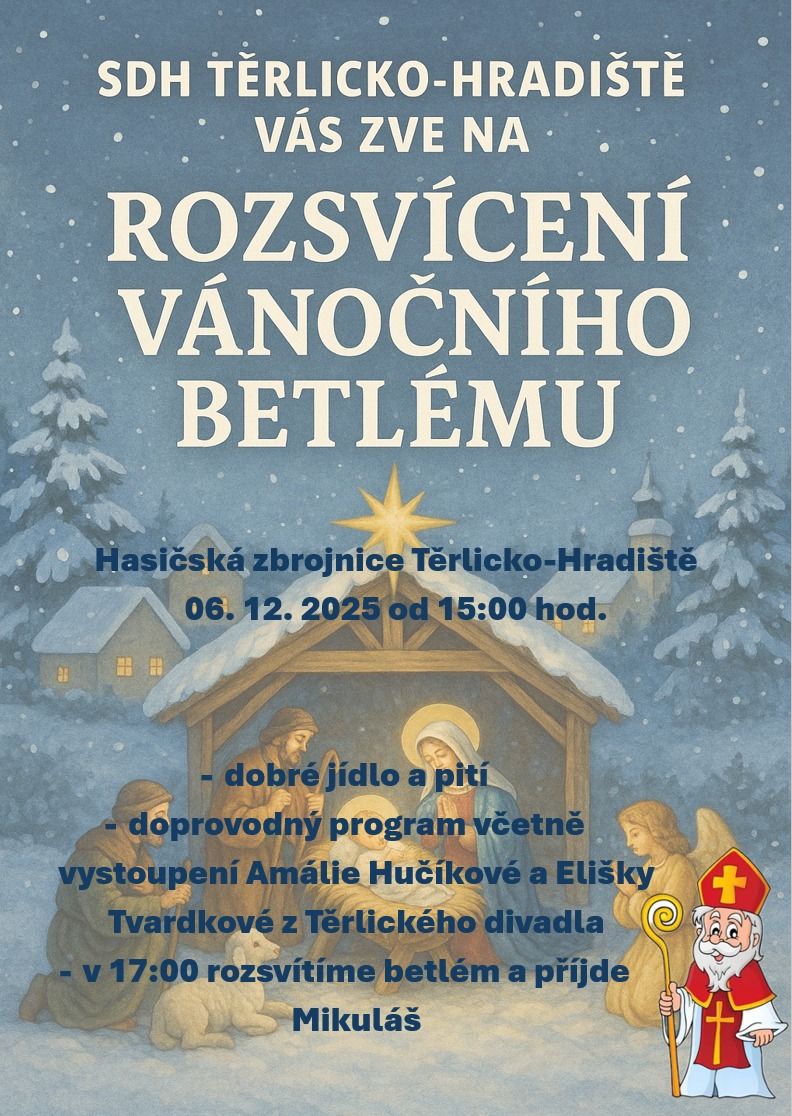 Rozsvícení vánočního betlému u hasičské zbrojnice v Hradišti. 6.12.2025 15:00 Pořádá SDH Těrlicko-Hradiště V 17 hod rozsvícení betlému a Mikuláš Vystoupení Elišky Tvardkové a Amálie Hučíkové